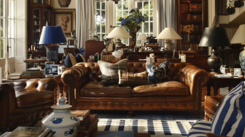 - Think: Ralph Lauren celebrates craftsmanship. Think Chesterfield sofas, wingback chairs, sturdy oak or mahogany tables, brass fixtures, and well-worn Persian or Oriental rugs. Pieces should feel substantial and built to last.
