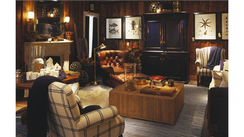 - The Cozy Family Den: Embrace dark, moody walls (burgundy, charcoal, or deep green) for ultimate coziness. Choose a large, comfortable sectional or deep leather sofa in a forgiving brown. Add a massive chunky knit throw and pillows in buffalo check or cable knit. Use warm wood tones and incorporate vintage sports memorabilia or framed travel posters in wooden frames. A stone fireplace surround is the ultimate RL den touch.